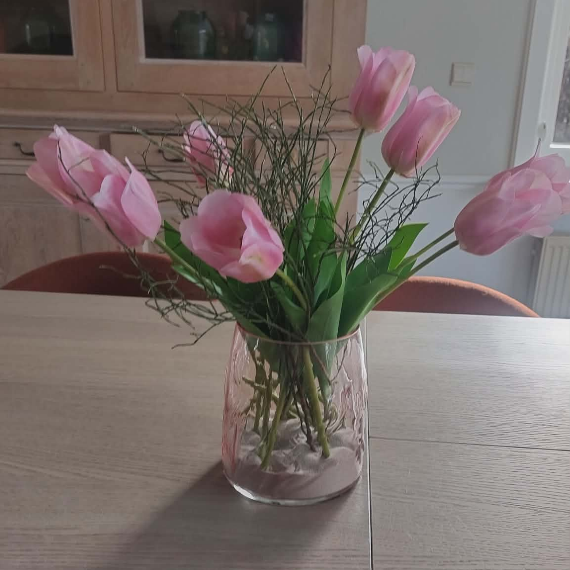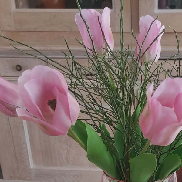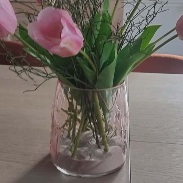 De doorzichtige roze vaas straalt zachtheid en klasse uit en wordt stijlvol aangevuld met 9 hoogwaardige roze zijdetulpen. De tulpen hebben een natuurgetrouwe afwerking en behouden hun schoonheid seizoen na seizoen, zonder onderhoud.